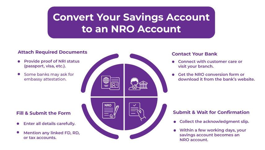 NRIs must immediately convert their regular savings bank account into an NRO account upon a change in residential status.