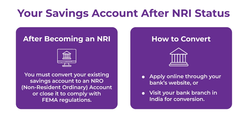 Upon attaining NRI status, an individual must immediately convert their existing savings bank account to an NRO (Non-Resident Ordinary) bank account or close it to comply with FEMA regulations.