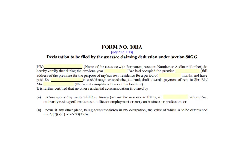 - Under section 80GG of the Income Tax Act, it is mandatory to fill out Form 10BA to claim a rental tax deduction.