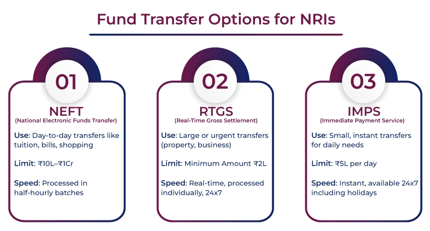An NRI uses NEFT, RTGS, and IMPS to transfer funds to an NRO Account in India, depending on the transaction's urgency and amount. The difference between these three lies mainly in their transfer limits, settlement speed, and the reason for use.