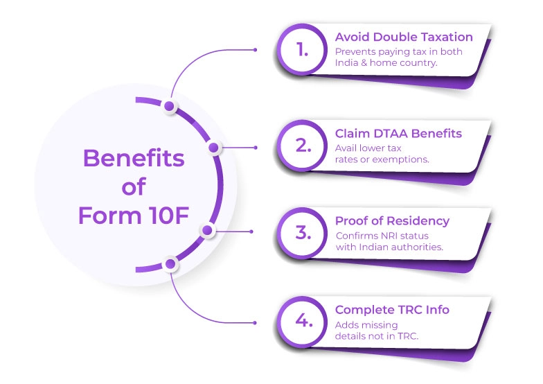 Form 10F is used by an NRI who wishes to claim the benefits of India's tax treaties with other countries (DTAA) and also to avail a reduced rate of TDS on the income they earn in India.