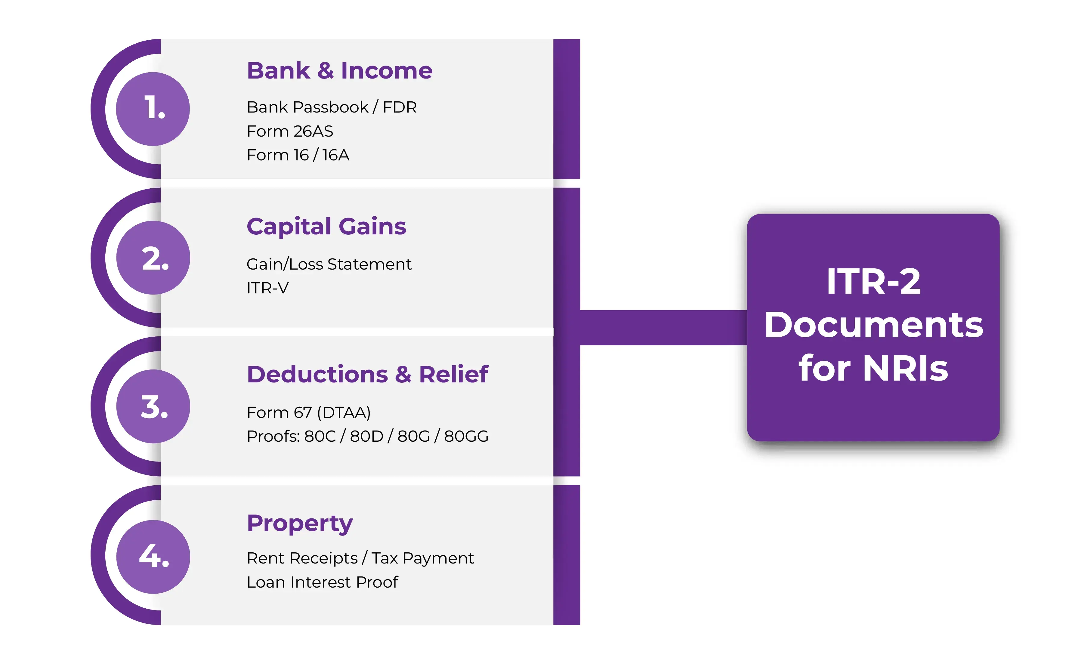 Gather Form 26AS, bank statement, capital gains details, foreign income details, information about loans/investments, proof of deductions, and Form 16 (if worked in India). NRIs must mainly focus on Indian bank accounts and property, and must determine which deductions an NRI is eligible to apply for.
