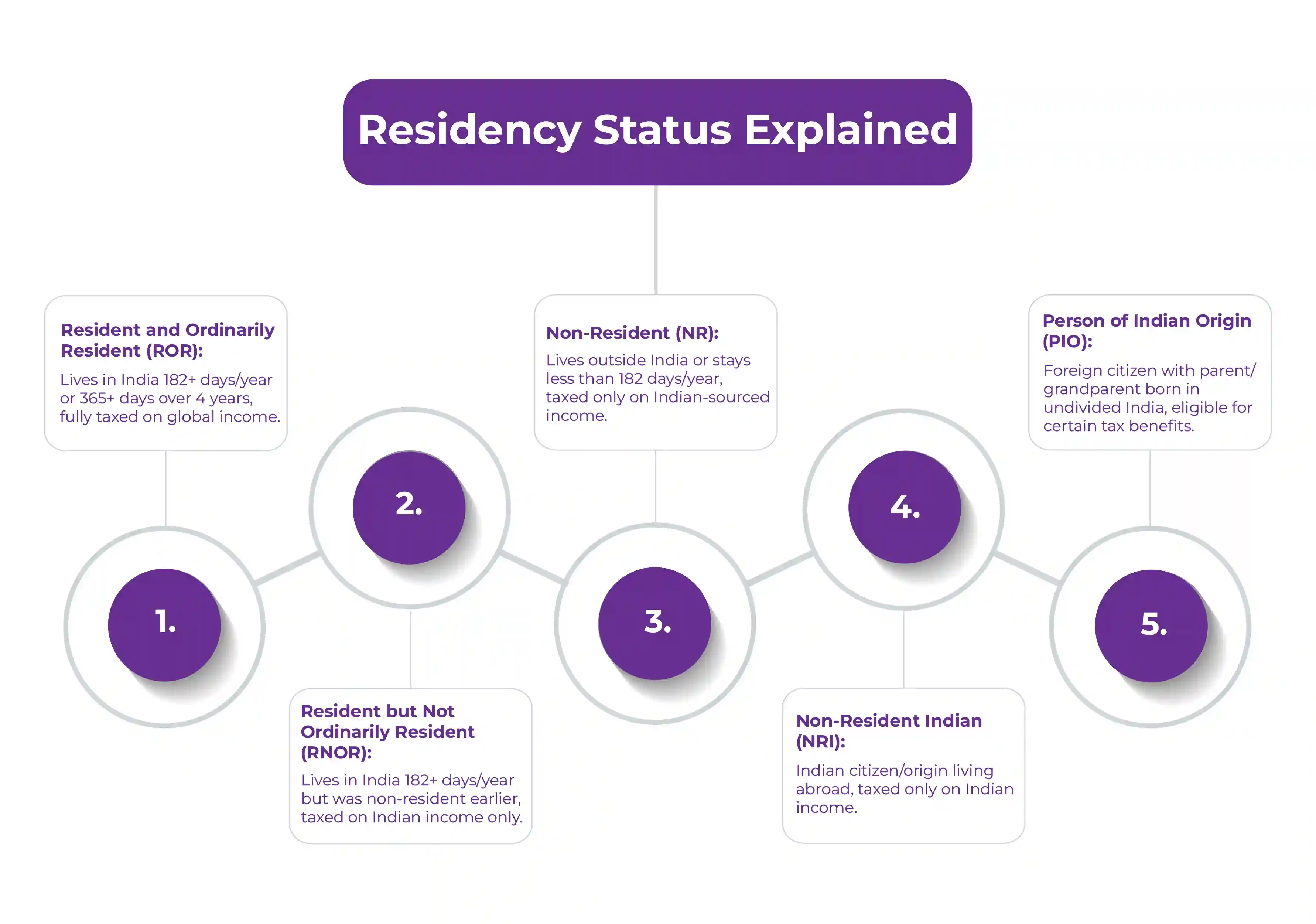 For income tax purposes, to determine the residential status in India, the Income Tax Act defines three statuses. These are as follows: